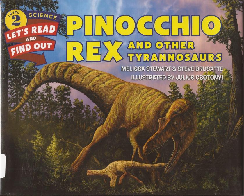 This 2017 book, written by Melissa Stewart (who also authored Mega-Predators of the Past) & Steve Brusatte and illustrated by Julius Csotonyi, capitalizes on the relatively recent discovery of Qianzhousaurus, nicknamed “Pinocchio Rex” for its unusually long and skinny snout. Using the hook of a strange and interesting new species, it launches into an overview of the tyrannosaur family as a whole, with eleven different species featured. It gives a very good sense of the breadth of tyrannosaur diversity and evolution. We see tyrannosaurs of every size and shape, from the smallest, earliest members of the lineage, to the last and largest in the form of Tyrannosaurus rex itself. As the authors introduce us to each species, they add their names to a timeline at the bottom of the page, allowing the reader to follow their changes over time.