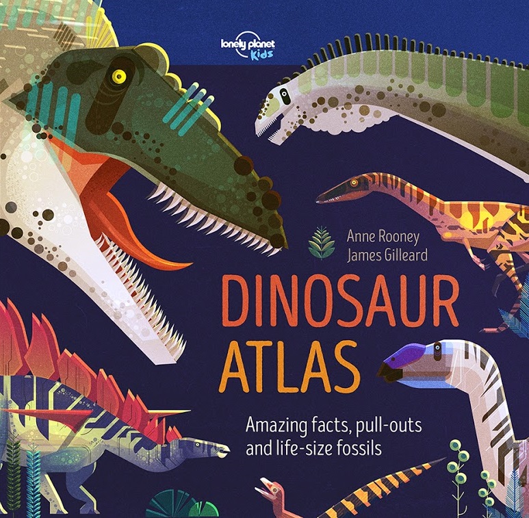 Dinosaur Atlas, written by Anne Rooney and illustrated by James Gilleard, features various dinosaurs and other Mesozoic animals organized by continent, as well as introductions to basic paleontological concepts and methods. This includes moments and individuals from the history of paleontology, from Cope & Marsh’s “Bone War”, to the recently deceased Jose Bonaparte, to the mother of paleontology, Mary Anning (for more on her, see my reviews of Mary Anning’s Curiosity and Dinosaur Lady).