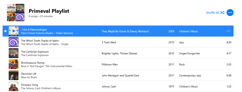 I once had a go at listing most of the science-focused musicians or songs that I’m familiar with. Not all of them are about paleontology, but several would qualify. Reading through it now, I should make some minor updates (e.g.: I’d probably now consider “Girl Talk” my favorite song by The Amoeba People), however the list of entries would remain largely the same.