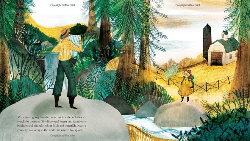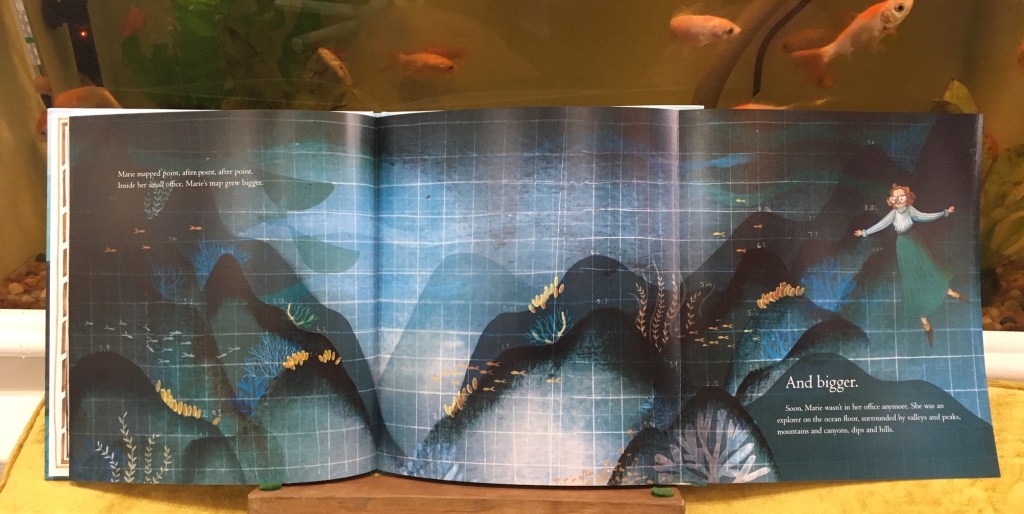 Hickey splashes each page with warm, colorful paintings that bringing an approachable, light-hearted feel to the book. The characters all feel highly expressive, and do much to convey the wonders and struggles of Marie’s experiences. I particularly liked the design choice of the fold-out page in the middle of the book, which in a rather metatextual sort of way nicely parallels Marie’s metaphorical dive into the ocean via her scientific data.