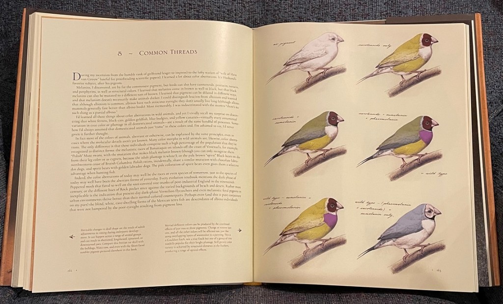 Katrina and her husband, Hein, both have backgrounds in museum curation, and Hein has long kept and bred pigeons, with the intent of figuring out the particulars of how certain genes express themselves in particular traits. This backdrop informs much of Katrina’s work, and you can really sense the passion borne of a lifetime of personal research and observation in every page. This is really the book’s greatest strength, as I can’t imagine how else a book so dense and detailed as this could remain so engaging and understandable to a layperson such as myself. I, of course, have to credit her illustrations here as well. The illustrations depicting the results of the expression of different genes on coloration were particularly revealing.