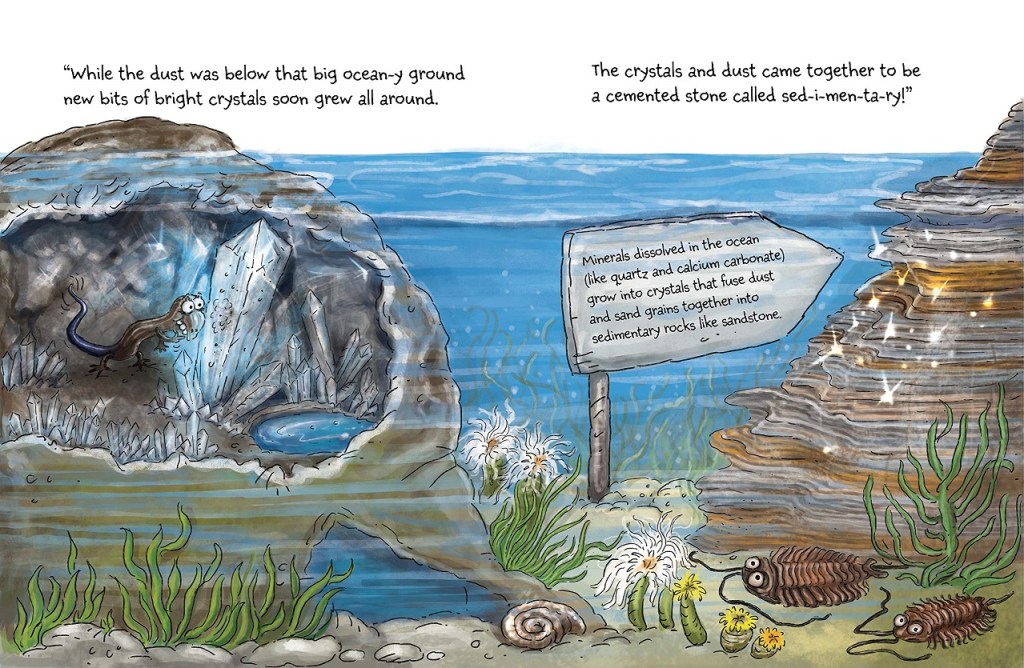 The story depicts a decent overview of the different stages of the rock cycle that mineral particles can go through. We follow a speck of dust (accompanied by a goofy Many-Lined Skink) from its disturbance by the thundering feet of a T. rex, to its compaction and lithification on the sea floor, to its uplift on the top of a volcanic mountain, to its eventual erosion, whereupon it catches a breeze and finally makes it to the nostrils of our protagonist. If I could make one change, I would have probably included subduction somewhere along the way, which could have easily led to the volcano page. It could have also allowed for a mention of continental drift, as well. I understand that there may have been limited space to tell the story though, and that not every particle out there in the real world necessarily goes through every possible stage of the rock cycle.