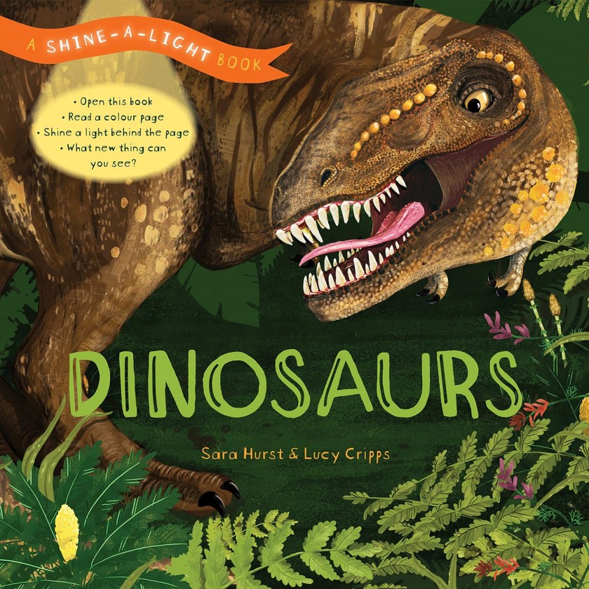 Written by Sara Hurst and illustrated by Lucy Cripps, Shine-A-Light: Dinosaurs reads like any number of similar books about life in the time of dinosaurs (say, for example, History Uncovered: Dinosaurs), but with one significant twist that sets it apart. The front side of each page features lushly illustrated paleo-environments suspiciously scant on inhabitants, while the reverse side is all-black, save for some “reverse silhouttes” of various dinosaurs and other prehistoric creatures. If you look at the front side while shining a flashlight on the reverse side, the light shines through the opaque critters to make them appear as if by magic on the front side!