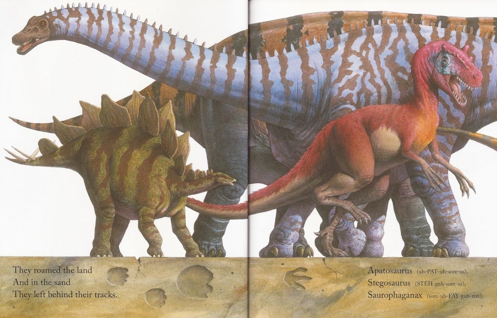 While the lovely illustrations certainly draw the eye, Nolan really captured my fancy with his writing. He delivers his story in poetic form, with an entertaining AABCCB rhyming scheme. As with I Am NOT a Dinosaur!, I’m impressed with how many ways the author managed to rhyme with his subjects names, except here even more so. While I Am NOT a Dinosaur! only had to keep finding rhymes for the word “dinosaur”, Nolan truly challenges himself with names like “Saurophaganax” and other similar mouthfuls. I have to applaud him for how surprisingly well it all works together, and makes the book feel that much more flowery and artistic as a result.
