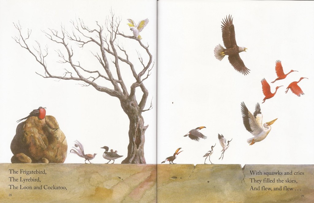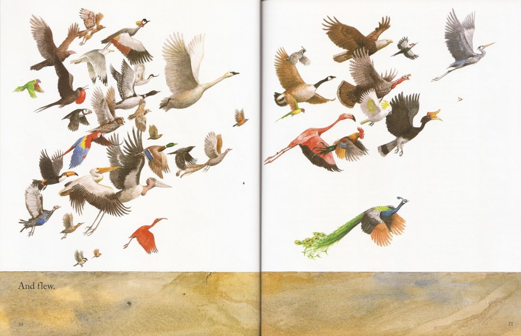 While the scraggly feathers on some of the non-avian dinosaurs work against it a bit, Dinosaur Feathers otherwise nearly seamlessly connects dinosaurs to their descendants like few other books I’ve read, whether for adults or children. As the authors of God’s Word or Human Reason? point out in their chapter on bird evolution, the transition between non-avian dinosaurs and their feathery descendants forms such a smooth gradient that the distinction between “bird” and “not bird” has become almost entirely arbitrary. To its credit, Dinosaur Feathers makes no equivocation about this. The lines “Who know why / They had to die” immediately precedes those on the next page, “Except a few / Whose feathers grew / And grew, and grew, and grew”, with no distinction made between those that died and those that survived, firmly nesting birds (pun intended) solidly within their saurian heritage.