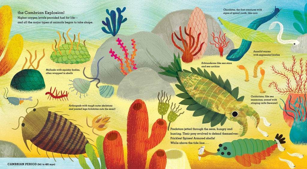 Just to demonstrate my point by way of comparison to a similar book, Out of the Blue has a significant advantage over the otherwise excellent This World Was Made For Me (from Annabell & Aiden), which delivered its information in even more of a storybook fashion, and consequently took more liberty in its descriptions of evolutionary transitions. I could potentially see readers come away from the latter book with the “but if we evolved from monkeys, why are there still monkeys?” fallacy unanswered, while Out of the Blue clearly illustrates how speciation is more a matter of divergence rather than strictly competition and extinction. (Incidentally, Annabelle & Aiden’s previous book, The Story of Life, did better in this regard, though I still prefer This World Was Made For Me to its predecessor overall.)