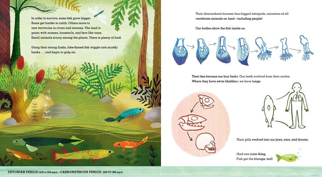 I’m very impressed with the writing in this book. Clear and concise, detailed but not over-complicated, Shreeve storytelling will be immediately accessible to younger kids while avoiding the sin of talking down to them. Evolutionary transitions, while simplified, are clearly explained. Coupled with diagrams by Preston-Gannon, it becomes very easy to see how many of these changes took place, which can also also instill an appreciation for comparative anatomy in readers.