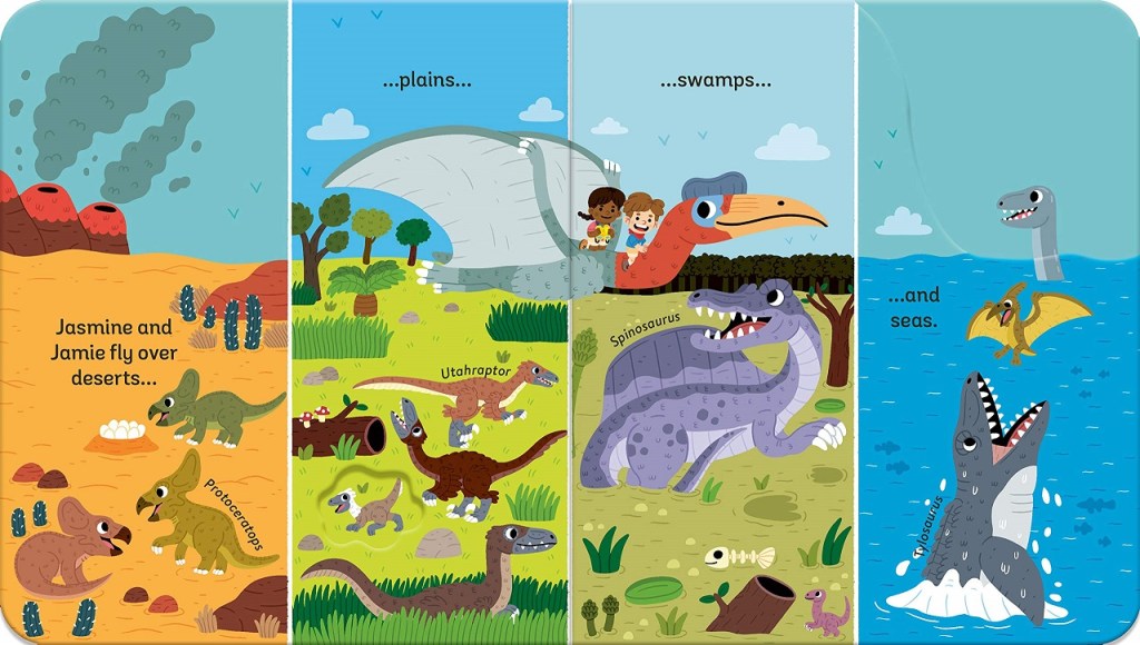 Written by Susan Hayes & illustrated by Sam Rennocks Zoom: Dinosaur Adventure is an early reader board book that takes readers on a tour of the time of the dinosaurs. A pair of young dinosaur enthusiasts, Jasmine & Jamie, lead the way as they travel back through time to search for their favorite prehistoric creatures. Jurassic Park fans (or at the very least, considering the age range, readers of the Jurassic Park Little Golden Book) may notice a clever easter egg in the form of Jasmine & Jamie’s outfits.