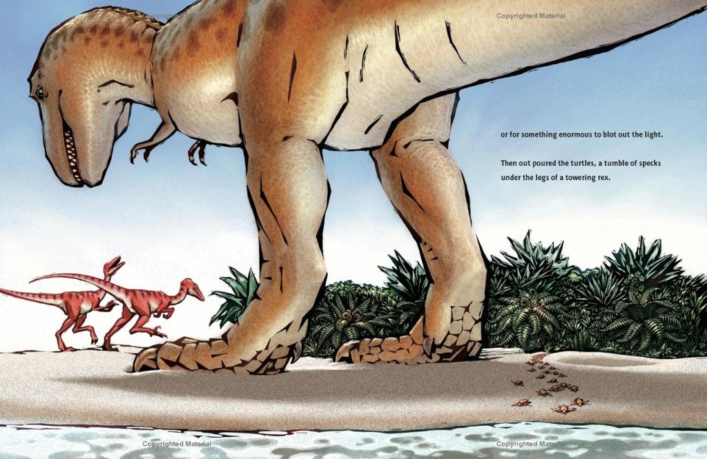 Kurt Cyrus’s rhymes are quite enjoyable to read, especially aloud. The writing is complemented by Cyrus’s usual illustrations, which are almost as pleasant to look at as his writng is to read. As one would hope, our hero looks great in all her illustrations, though with Archelon this is less of a guarantee than one might expect. Many non-specialist artists tend to just draw any old generic turtle shape that comes to their mind when they try to illustrate this taxon, with some straight up copying modern Leatherback Sea Turtles, or (more often) drawing some high-domed, hard-shelled tortoise-looking creature. Cyrus has clearly done his homework, however, and the protagonist of his book comports well to the the actual skeleton of Archelon. The other animals in the book look generally good as well, though the mosasaur’s scales could perhaps be a little less gnarly, and some small shoreline Troodon are depicted as scaly, when they should sport a coat of feathers instead.