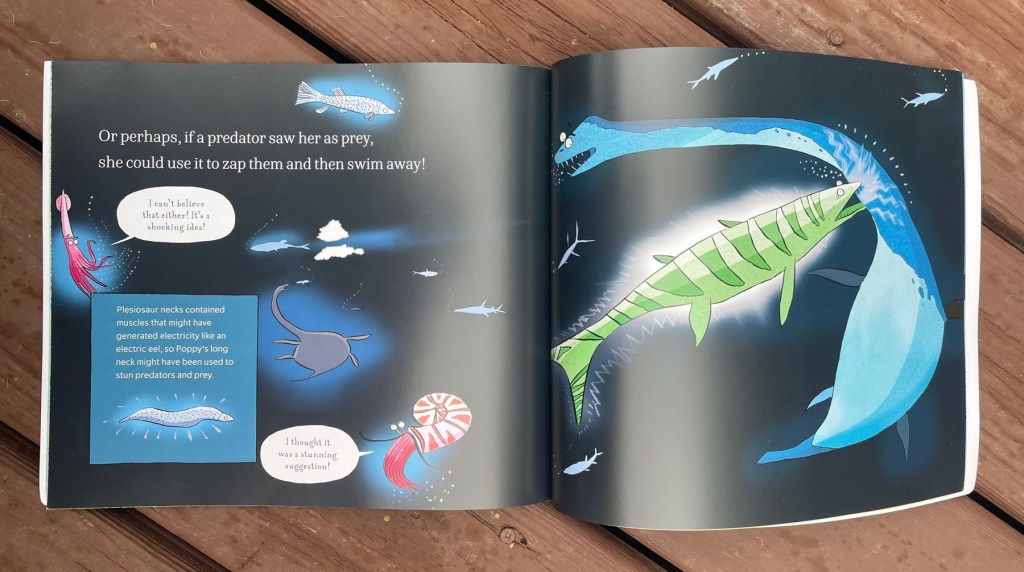 The entertaining writing and illustrations work to effectively educate children about its subject. Not only do readers learn a few things about plesiosaurs themselves, but the open-ended way in which the book presents the various suggestions about the function of Poppy’s neck encourages young readers to actually consider the pros and cons of each suggestion, rather than merely accept some received wisdom about it. This is a crucial step in internalizing the scientific method, and I applaud the author for taking this approach.