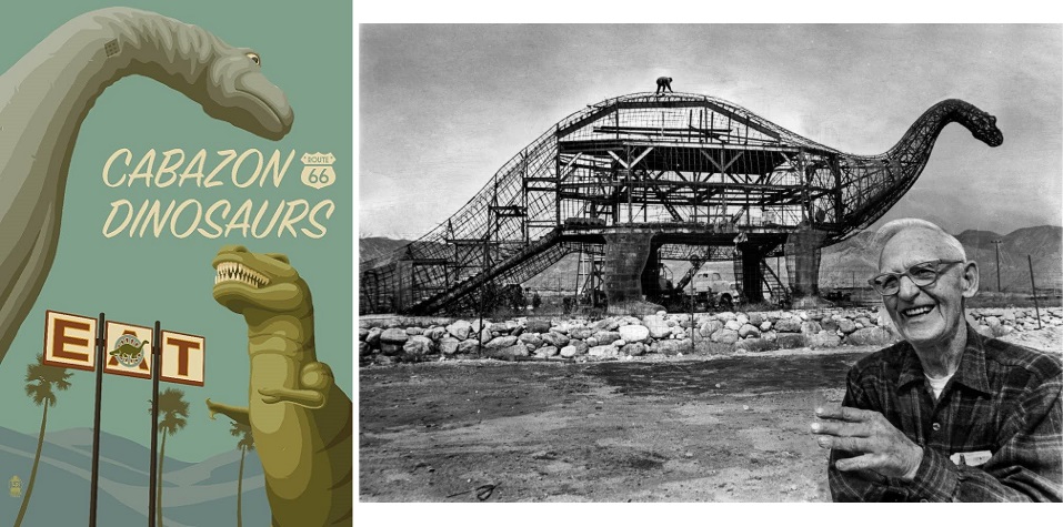 If you’ve ever made the drive from Orange County out to Palm Springs, California, you may have noticed a pair of large, concrete dinosaurs from the highway. Though development over the past decade has somewhat obscured the view of them from the road, they are nonetheless road trip icons, and an exemplary relic of so-called “California Crazy” pop architecture. These are the famous Cabazon Dinosaurs, a giant Brontosaurus and Tyrannosaurus which visitors can actually climb up inside.