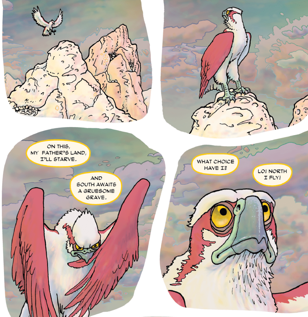 The stylistic differences between the perspectives of the primates and the birds are very creative. I especially like the use of distinct color palettes to reflect differences in color vision (seen as well in an early side story featuring an albanerpetontid, which used to be readable on the website back when Paleocene was available as a free webcomic, but sadly doesn’t seem to have been republished anywhere now).