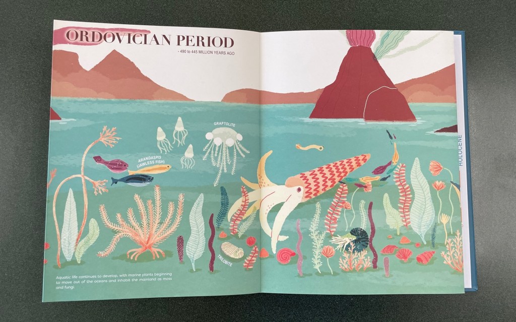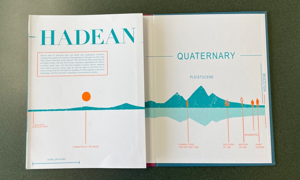 While the main side contains illustrated scenes that morph over time, the reverse side depicts a simple chart with major events marked on a line. While the illustrated side prioritizes a pleasant viewing experience, the chart prioritizes scale, depicting each unit of time proportionally to each other. I have to respect this decision, as this means the Precambrian takes up over two thirds of the entire length of the chart. A lesser book might have shrunk this timeframe down, as from a human perspective it looks relatively uneventful compared to the major changes that get crammed into the last 500 million years. They don’t call a major chunk of the Precambrian the “Boring Billion” for nothing, after all. I love it though. When even the time of the dinosaurs feels so long ago, it truly boggles the mind seeing just how vast our planet’s entire history truly is. It makes me think that this long expanse of time where life seemed “stuck” in single-celled form must have been anything but “boring”. Even in microscopic form, over such long ages life must have played out countless evolutionary dramas just as vital and complex as anything that came after the point some organisms finally became multicellular.