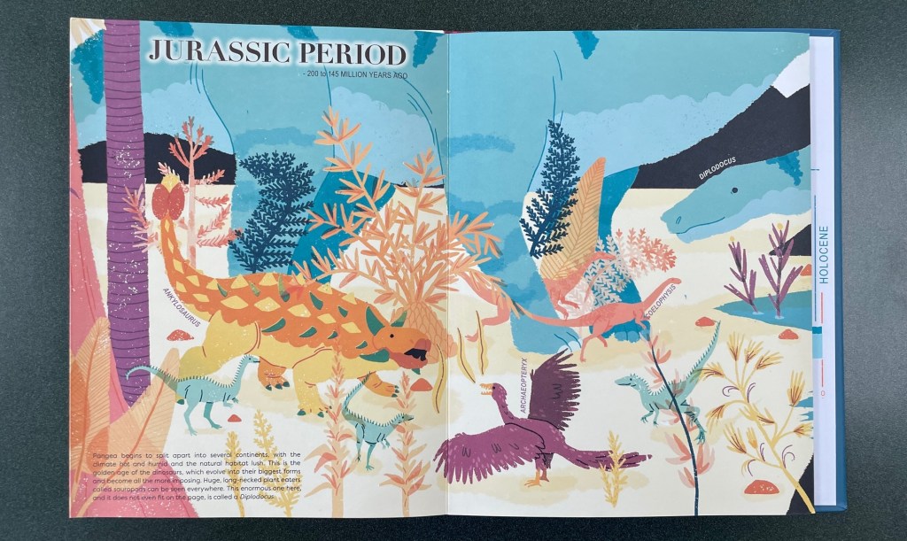 As for the content, the timeline covers all the major time periods from the Hadean to the present day, with two separate charts on either side of its massive “concertina-style” page. The front side features the author’s usual artwork, with backgrounds and lifeforms depicted in her usual vibrant style. I found it interesting that she remained consistent in her use of geologic periods throughout the timeline, rather than abruptly switching to the more fine-grained lens of geologic epochs upon reaching the Cenozoic like many other charts do. A bit of license is taken here and there with the placement of certain creatures, which I am inclined to give a pass to, but as the point of this book is to convey a sense of geologic succession, I suppose I should take some marks off for that. The way in which the Jurassic and Cretaceous dinosaurs bleed into each other stands out to me in particular. I suppose it means to depict the transition between periods as more of a gradient than a hard line, but here the effect comes off a little more on the side of seeming a bit out of order.