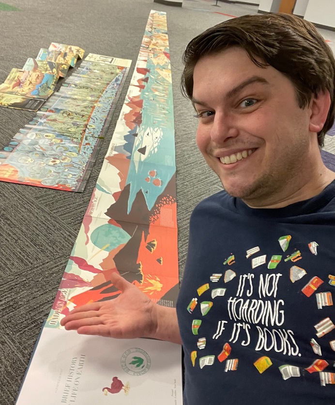 Upon opening the book, I discovered I had somehow missed the fact that it was a fold out timeline! (I suppose we can count that as proof of my admiration for Clémence Dupont‘s art that I bought sight unseen like that!) And let me tell you, this thing is massive. At 8 meters (26 feet) long (approximately the length of a Triceratops, incidentally), it leaves every other timeline I’ve seen in the dust (or should I say the Precambrian?). I didn’t even manage to unfold the entire thing until I visited my friend Diane at Billings Productions one day (the company that provides the animatronics used at the Heard Natural Science Museum among other places), and it extended through most of their central office space!