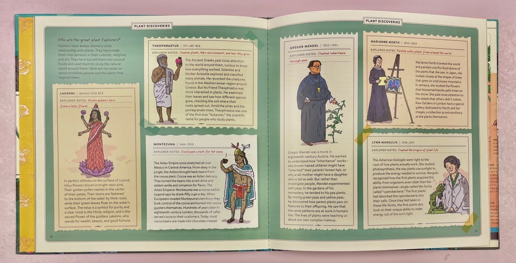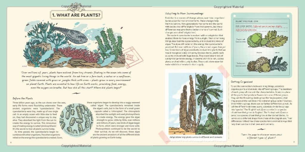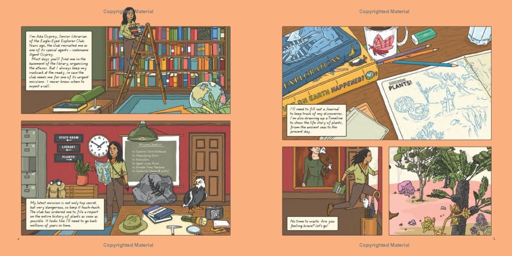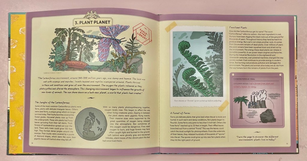 Designed in the same format as Dinosaurs! Explorer, Bugs! Explorer and Mammals! Explorer (and mostly similar to The Nature Timeline Wallbook as well), Plants! Explorer begins with a few chapters explaining the natural history of plants both prehistoric and modern. It is loosely themed in such a way as to feel like we are reading the journal of the time-traveling Agent Osprey, though it doesn’t commit to this theme quite as much as some more lavishly designed books.