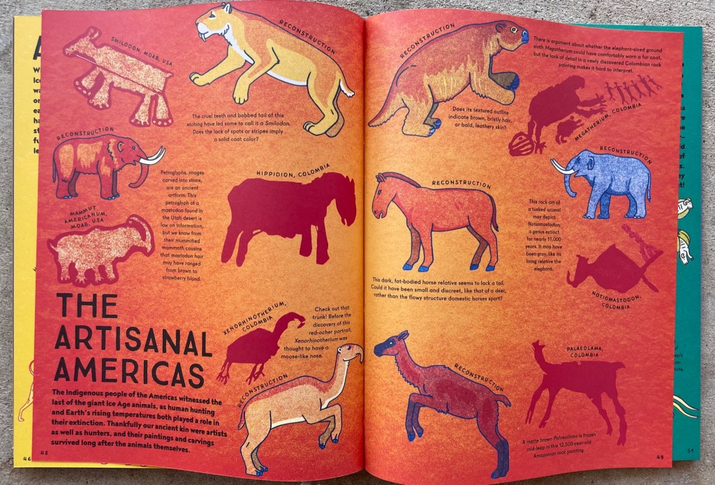 Things take an interesting turn towards the end of the book though, when Greer shows us artwork from prehistoric humans, which gives us insight into the appearance of animals for which we have no direct evidence for their external soft tissue. It feels at once both novel and banal; previously, little attention had been paid to the colors of animal figures in cave & rock art, but when you think about it, why wouldn’t we at least try to glean some useful information from prehistoric eyewitnesses (taken with a grain of salt for artistic liberties, of course)? I hadn’t heard of anyone using this resource until Darren Naish published a pair of articles at Tetrapod Zoology calling attention to consistent color patterns on illustrations of Wooly Rhinoceros and the so-called “Irish Elk“. Greer further explores what info we can glean from prehistoric artwork from around the world. The Columbian illustrations on the “Artisanal Americas” prove how up-to-date their information is, as these were only discovered and published on extremely recently.