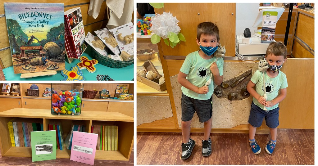 I also must praise their gift shop’s selection. They had plenty of good books on sale, including copies of the official scientific journal put out by the museum! I’ve never seen a museum that delivers the actual research directly to their visitors like this, and I for one think it’s an idea many other museums should consider doing as well (not necessarily by publishing their own journals, but offering copies of relevant scientific papers for sale). I bought myself a book on local dinosaur discoveries produced for New Mexico’s centennial statehood celebration. Oddly enough, I also saw a book called “Bluebonnet at Dinosaur Valley State Park“, a fanciful tale about an armadillo who meets her time-traveling great-great-uncle glyptodont at Texas’s Dinosaur Valley State Park. I had already found this book at my local library, and have been meaning to review it for some time. It was so funny finding this here, of all places! (I also saw Dinosaur Feathers and Animals of a Bygone Era for sale here, which I had good things to say about.) The toy selection had unfortunately taken a bit of a hit since my first visit, when it had a selection of Safari Ltd. and Papo models that surpassed even that which made me praise The Whiteside Museum‘s gift shop so highly. Sadly, this time there were only a few of the more common Papo models available. That’s just the entitled geek in me talking, though. There were plenty of cool toys and other items sure to tempt visitors less narrow-minded than myself! I have to admit the Ceratosaurus skeleton grabbers my sons got are pretty awesome.