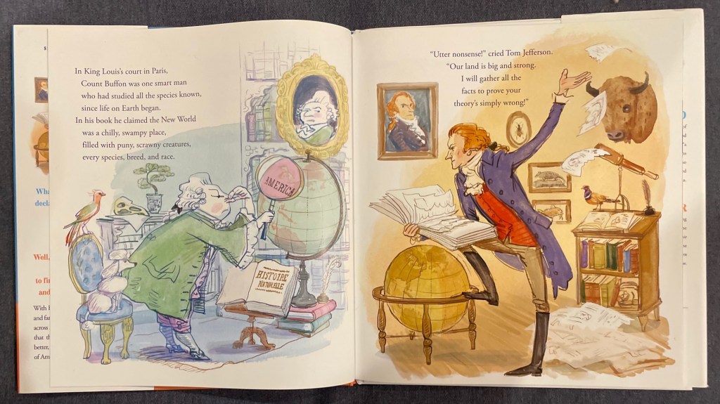 It’s a very light-hearted book, written in rhyming prose that makes it very fun to read aloud, augmented by the bright, colorful illustrations. Both words and pictures mostly depict the events of the story in a semi-metaphorical manner, such as Jefferson chasing after the haughty Count de Buffon to harangue him on his dismissive attitude towards American wildlife, all while riding on their respective Old and New World pachyderms.