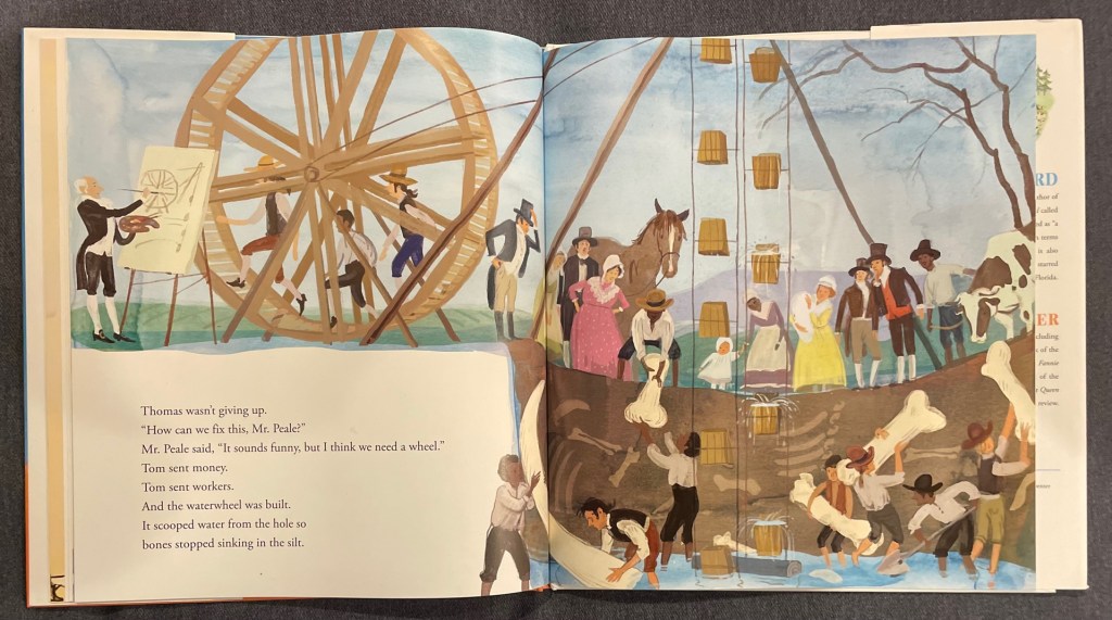 Additionally, while Founding Monsters went into greater detail in the actual text of the story, this book does mention more of the known enslaved people who contributed to this history in the author’s note at the end. Moses Williams (who was described more thoroughly in Founding Monsters) appears, along with Jefferson’s domestic slaves Jupiter Evans & Robert Hemings, and the sole African-American member of the Lewis & Clark Expedition, York. The author laments that we do not know more of their contributions, or what they thought about the fossils they helped to handle, a sentiment I can’t help but share.