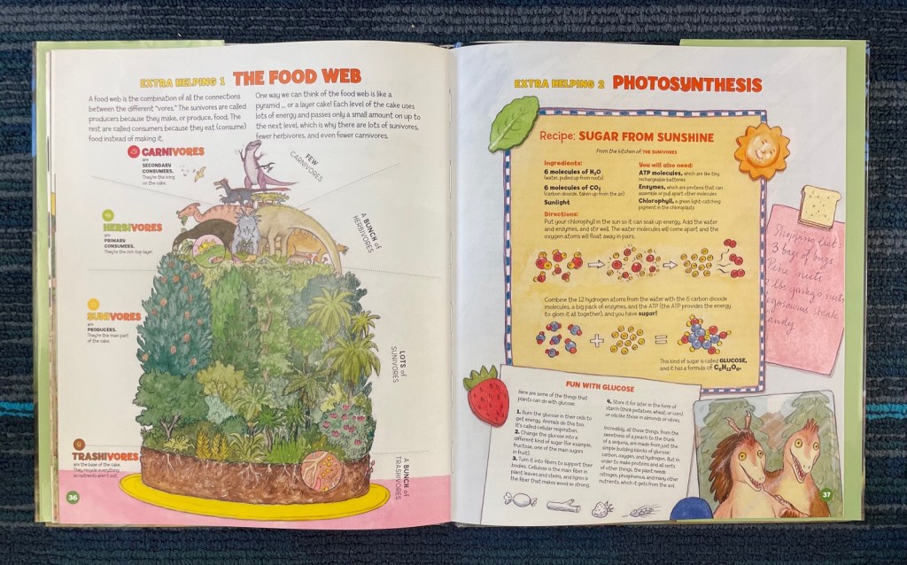 The book includes a couple of appendices, though not as involved as the ones in When Fish Got Feet, Bugs Were Big, and Dinos Dawned. I do like the visualization of food webs as a “layer cake” of trophic levels. The thickness of each layer roughly corresponds to the overall biomass in a given ecosystem that each level represents, which helps readers visualize how much of a given type of creature is needed to support the creatures in the other levels.