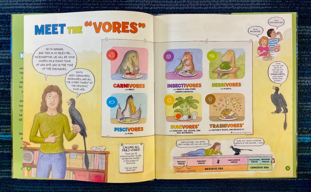 Guided throughout by Hannah Bonner herself and her Microraptor buddy, Dining With Dinosaurs introduces readers to the various roles that different creatures adopt in order to feed themselves, and then looks at what we know about those roles in prehistoric ecosystems. Bonner’s trademark attention to detail is on full display here, as we examine carnivores, herbivores, omnivores, insectivores, piscivores, “sunivores” (autotrophs), & “trashivores” (detritivores). We don’t just focus on the “crowd-pleasers”, either, as all levels of the ecosystem get their starring moment, from plants, to dinosaurs, and to bacteria. We even get to see different non-dinosaur creatures that plagued the seemingly-invincible dinosaurs themselves, from Sanajeh the sauropodlet-eating snake to Sue‘s painful-looking jaw infection.