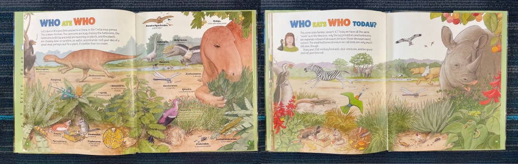 I’ve always had high praise for the work of Hannah Bonner. Her “When” trilogy, now compiled into the single volume When Fish Got Feet, Bugs Were Big, and Dinos Dawned, sits at the top of my list of favorite children’s books on prehistory. Her attention to detail & her cartoon illustrations combine to make her books among the most comprehensive and yet approachable paleontology series out there, save perhaps for Abby Howard’s “Earth Before Us” series, which adopts a similar approach to Bonner’s. Here we’ll take a look at Bonner’s first prehistory book outside of the “When” series, Dining With Dinosaurs: A Tasty Guide to Mesozoic Munching.