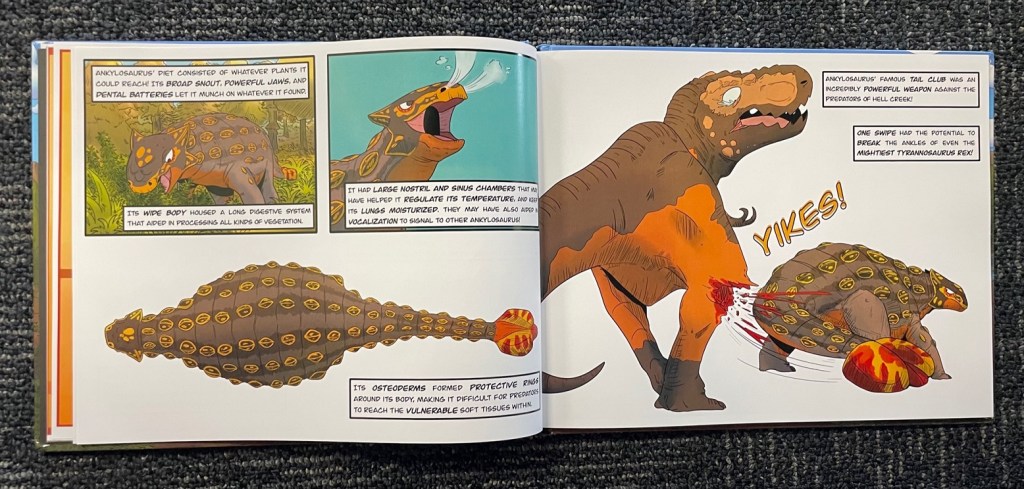 Hell Creek is famous as both the home of Tyrannosaurus rex, and one of the last known dinosaur-bearing geologic layers laid down prior to the End Cretaceous extinction event. It’s certainly a popular subject in paleontological literature, and plenty has been written on it before. In fact, if I had to describe Did You Know Dino? Hell Creek in reference to other books, I would say it’s basically Saurian – A Field Guide to Hell Creek by way of Abby Howard’s Earth Before Us series. I don’t mean to suggest it is one and the same as the Saurian book, though there is definitely a similarity in structure. Saurian focuses on a particular moment in time, narrating as though one is visiting a particular locale in Hell Creek, while the Did You Know Dino? book takes a broader view, looking at the formation as a whole. It also hits a perfect sweet spot of factual accuracy with easy to digest illustrations & tidbits of information. But don’t mistake its seemingly light-hearted appearance for softness; Andy isn’t afraid to portray the more gruesome sides of nature when necessary, as one can see in the Ankylosaurus image I’ve shared above. There’s no rose-tinted glasses, here!