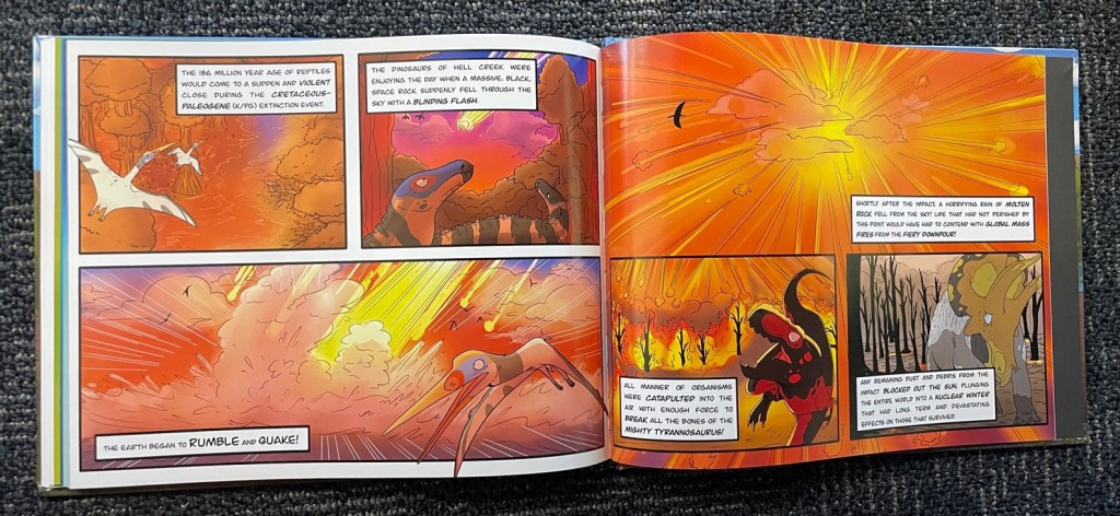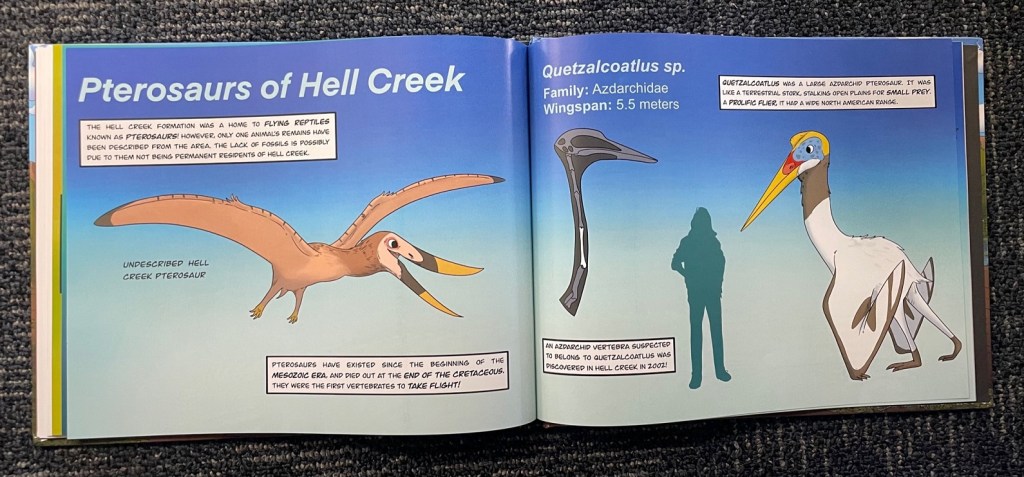 Much to my excitement, Andy has just made the jump to his first print book, Did You Know Dino? Hell Creek. It actually got published via Ted Rechlin’s Rextooth Studios, who my readers may remember from my reviews of Ted’s books Jurassic, SUE, Sharks, and 50 Million Years of Whales. Rextooth Studios has actually begun partnering with other authors to help publish their work, starting with the updated edition of David & Jennie Orr’s Mammoth is Mopey (which reminds me: I need to update my review!). While it would have been easy enough to simply repackage his webcomics, Andy has opted to deliver all-new content to his readers and expand his scope to describing an entire paleo-environment, the titular Hell Creek.
