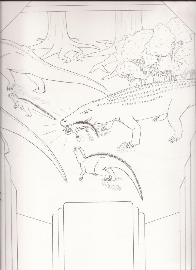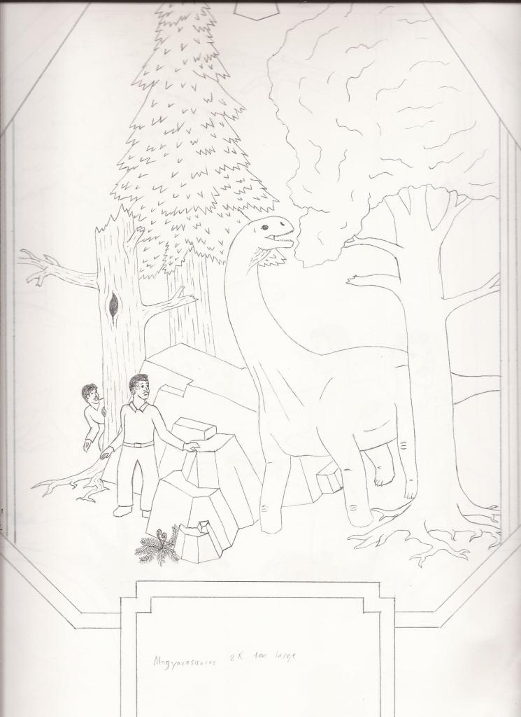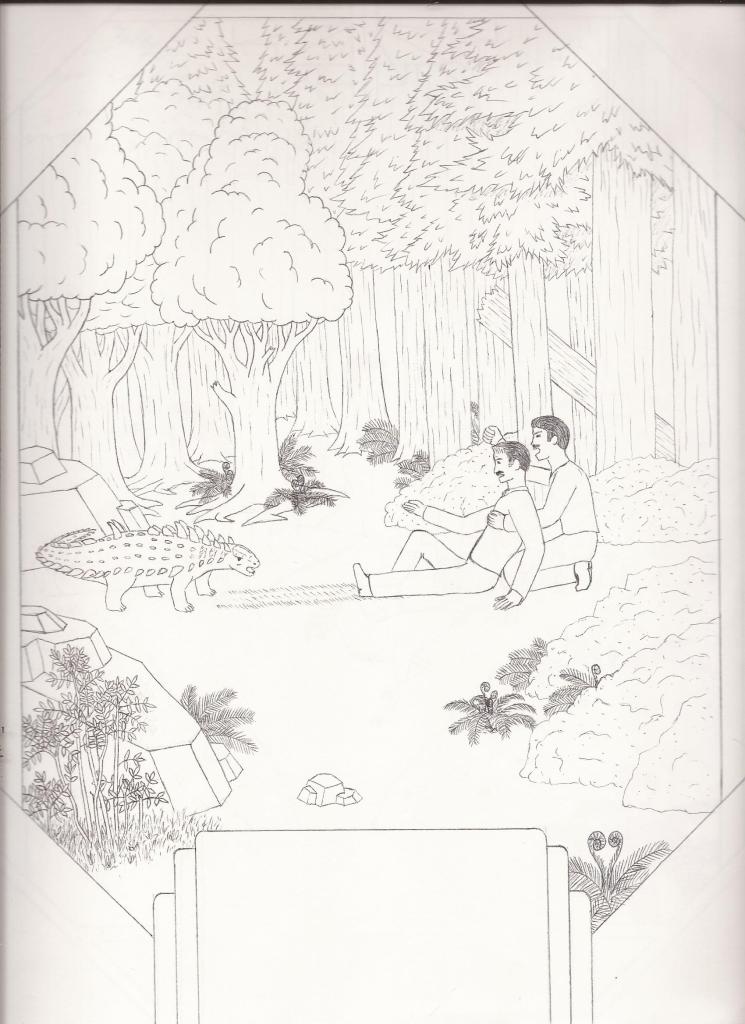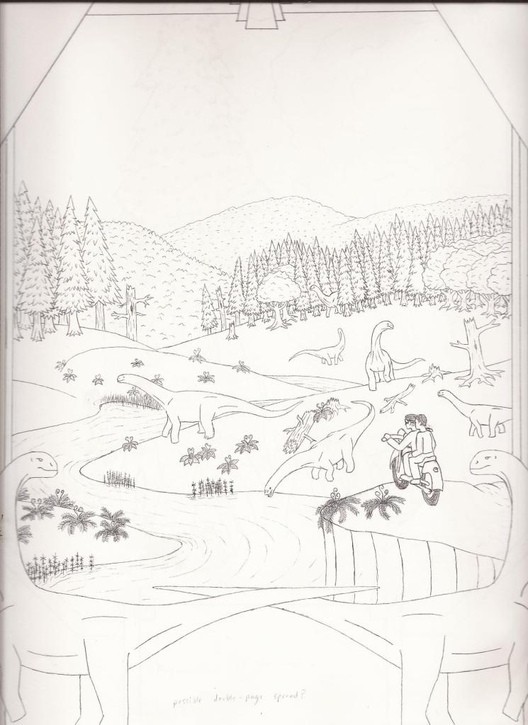 I’ll post the illustrations alongside the text I wrote for each scene, with occasional comentary in parentheses. So without any further ado, here’s Dino Dad’s “Dinosaurs of Transylvania”!