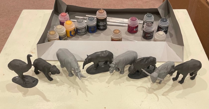 I managed to find not one, but two species of bison: the modern Plains Bison, and the Pleistocene Long-Horned Bison, Bison latifrons. (The B. latifrons is actually on the small side, being 1:48 scale as opposed to the 1:35 of the rest of the models I bought, but at least it doesn’t look too out of place.) In addition, I got myself a Giant Moa (Dinornis robustus), the large dicynodont Kannemeyeria (related to THE BIG DIE‘s Lystrosaurus), the sabertoothed rhino-like Uintatherium, another multi-horned, rhino-like creature called Arsinotherium (which might actually be closer related to elephants), Pyrotherium (one of the bizarre animals that evolved in the isolation of South America), and Moropus, a giant-sloth-like relative of horses.