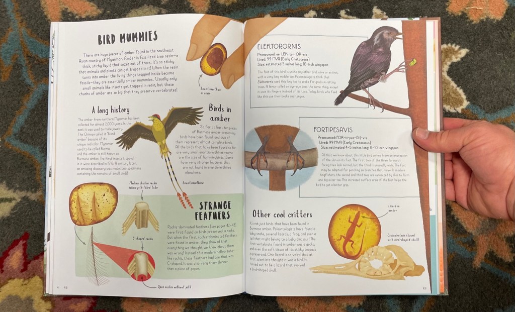 The second point dredges up a bit more controversy. While I can appreciate that O’Connor would want to focus on the science and not burden the younger target audience with sociopolitical issues, the Burmese Amber page probably should’ve included at least a small note on the ethical complications of study nonetheless. Many scientists have expressed concern with regards to acquiring Burmese Amber for study, as sales tend to directly benefit armed conflict in the area, with some organizations even recommending an embargo on studying specimens from this region for the time being. Any discussion of these finds practically begs for these issues to at least get a passing mention. It especially stuck out to me since the text goes so far as to mention the specimens have earned the nickname “Blood Amber” as a reference to their color, while completely ignoring the obvious double-meaning that term has since incurred. That being said, I certainly wouldn’t advocate that this book ignore Burmese Amber entirely. The specimens here are truly extraordinary, with details preserved that one could hardly have imagined in their wildest dreams, from legs & wings, up to and including a few whole bird bodies perfectly preserved!