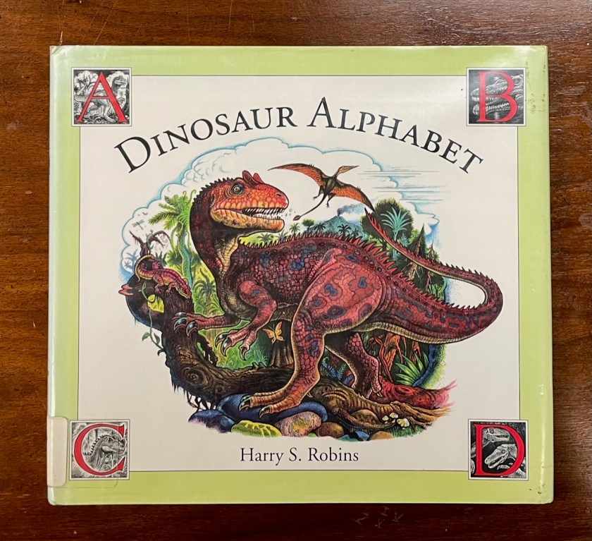 This one is a bit older than most books I review here, but I thought I would take a look at it to expand my catalog of “ABC books”. To that end, here’s Dinosaur Alphabet, written & illustrated by Harry S. Robins!