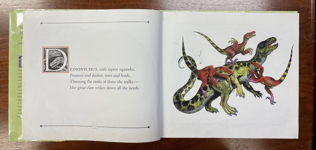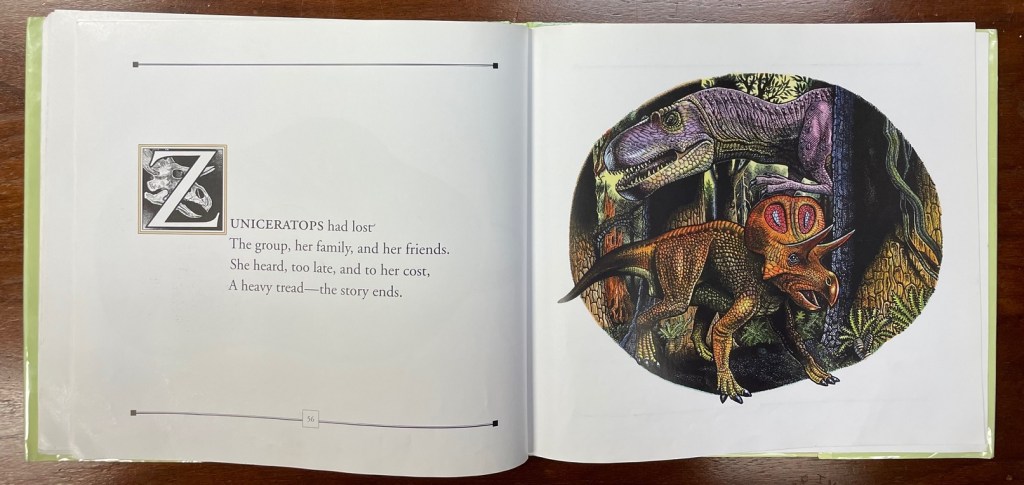 If you come across Dinosaur Alphabet at the library or a used book store, I certainly recommend picking it up for the fun poems and maybe even the recent-history perspective on paleoart, but I wouldn’t necessarily go out of my way to find it. If you’d like to see more prehistoric ABC books, check out my list of past reviews of ABC books here!