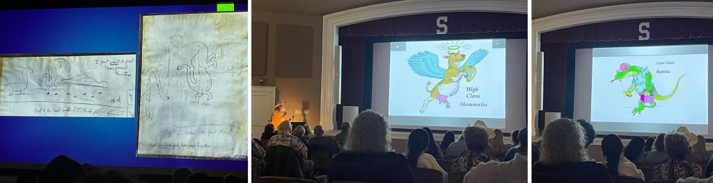The lecture series ran most of Friday & Saturday, and till early afternoon on Sunday. The guest speakers included the one-and-only Dr. Bob Bakker (Mister “Dinosaur Renaissance” himself!), Dr. Scott Persons, Carl Mehling, Amelia Zietlow, Cate Larson, Myria Perez, Cody Schulte, James Washington, Mike Eklund, Evelyn Vollmer, and the Whiteside’s director/curator Chris Flis. While I only attended the Saturday talks in-person (and not even all of those due to my antsy boys), I was able to catch some of the others on the event’s livestream, and my friend Thomas Strimpel caught me up on some of the others I missed when we hung out with him. This all-star lineup delivered some very enjoyable talks, at least from the perspective of this paleonerd. My sons might disagree. There was a surprising amount of “coproliteposting” in some of them, including cartoons by Bob Bakker, and recently discovered doodles by historic paleontologist Roland T. Bird that joked about some of the footprints he discovered while conducting the original surveys of the Paluxy trackways and nearby dinosaur traces. I particularly enjoyed Amelia‘s mosasaur talk, which hinted at some major shakeups she intends to publish on soon.