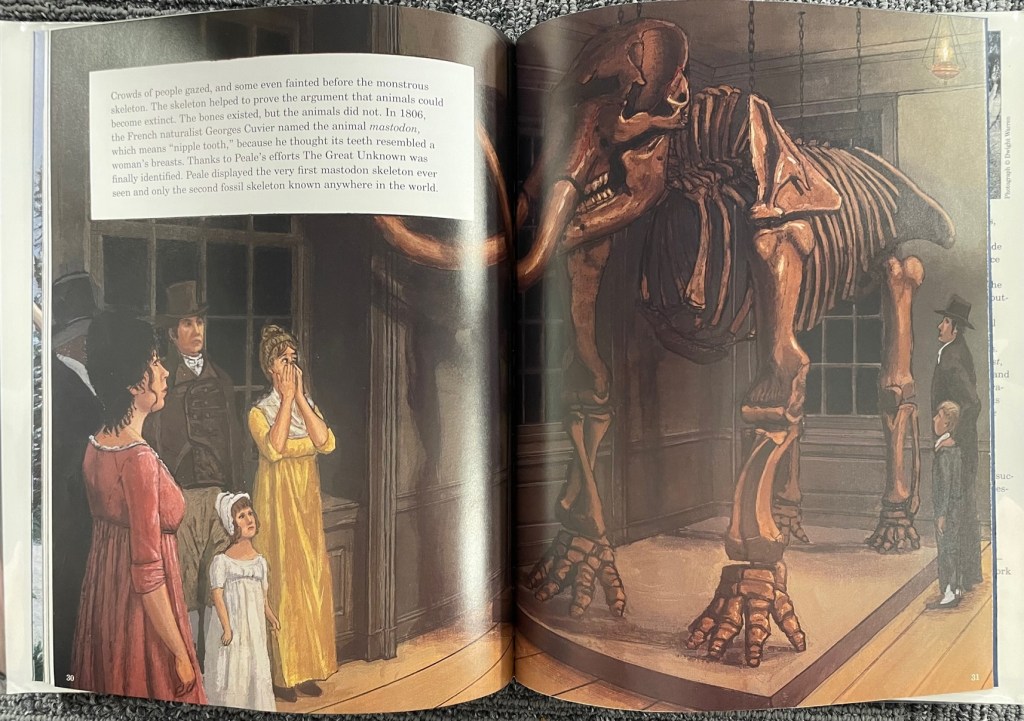 Compared to Founding Monsters & Thomas Jefferson and the Mammoth Hunt, which covers some of the same information, this one feels somewhat more “formal”, mostly do to the use of fully detailed paintings as opposed to the cartoons of the other two. It’s told in more of a narrative format that Founding Monsters, but in a much more detailed and linear style than Thomas Jefferson and the Mammoth Hunt.