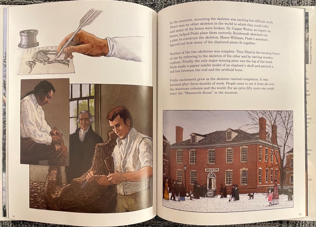 Unlike either of the other books I’ve looked at, this is also very much Charles Peale’s story, focusing more or less exclusively on the excavation of the Mastodon found on John Masten’s farm, and the preparation of those specific fossils. It does not overtly refer to the wider scientific context of the time, and even Thomas Jefferson is hardly mentioned. It’s a little refreshing to have this slightly reoriented focus, and gives a certain amount of focus to the story.