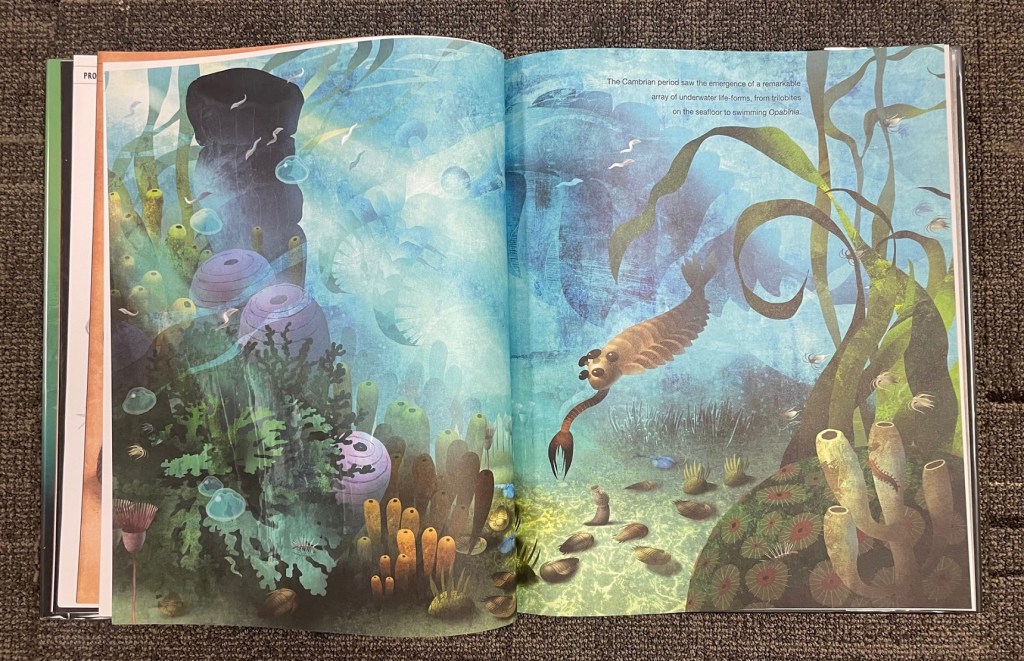 I’m particularly impressed that the book explicitly called out the popular perception of the so-called “Boring Billion” era of the Precambrian, in which relatively little geologic activity occurred. Directly contrasting with this perception, the book labels these pages “The Not-So-Boring Billion”, illustrating simple multicellular organisms that managed to get fossilized during this time, which the text points out indicates a lot of “under the hood” evolution going on, invisible to typical fossilization patterns. Most multicellular life belongs to the eukaryotic domain of life, indicating that the major changes that define this group occurred sometime earlier in this era as well.