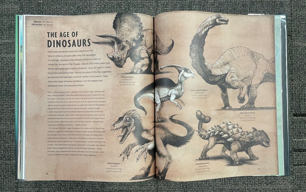 As occasionally seems to happen in more broadly focused books like this (see for example In The Past & The 50 State Fossils), while the artwork for Paleozoic fauna is pretty accurate to the real organisms, the illustrations get significantly less rigorous for the dinosaurs & other Mesozoic reptiles, what with their somewhat loosely-interpreted body shapes, and giant crocodilian scutes randomly placed across their skin. An illustration that clearly references Apatosaurus is also mislabeled as a Brachiosaurus, though that fault likely doesn’t lie with the illustrator.