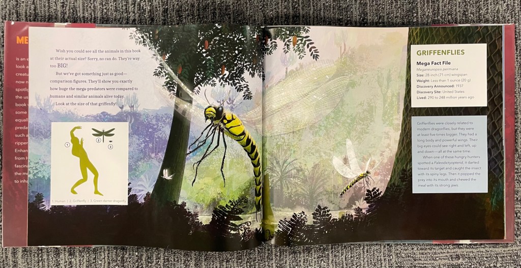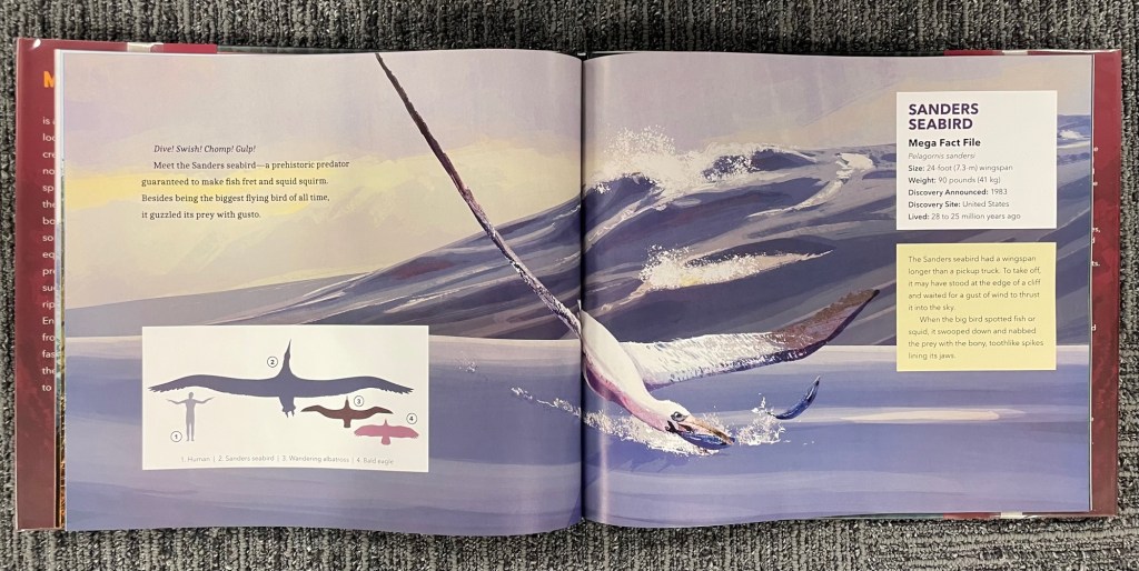 Some creatures are too well-known by their scientific names to be referred to as anything else, however, and so certain names like Archelon appear unchanged. I would contrast this book with I Am NOT a Dinosaur! in this regard, actually, as the latter similarly went back and forth on common vs. scientific names, though there was less rhyme or reason to the shifts in that one. Both books do make the mistake of referring to Carcharodon megalodon, as it has been reassigned to the genus Otodus, though as the more recent release, Mega-Predators has less of an excuse for this error. (Ted Rechlin’s comic book, Sharks: A 400 Million Year Journey, managed to get it right in the interim between the two.)
