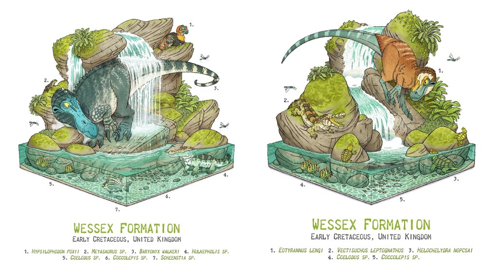 The Tyrannosaur’s Feathers takes a look at how our scientific understanding of the king of the dinosaurs has changed over time. The illustrator this time around by Stieven Van der Poorten, who first captured my attention with his delightful “slices” of famous paleo-environments, which are a neat way to get a quick understanding of these locales. His knack for immediately understandable illustrations that handily condense a general theme comes in very handy here, particularly with his brilliant cover illustration that succinctly conveys the subject of the book.
