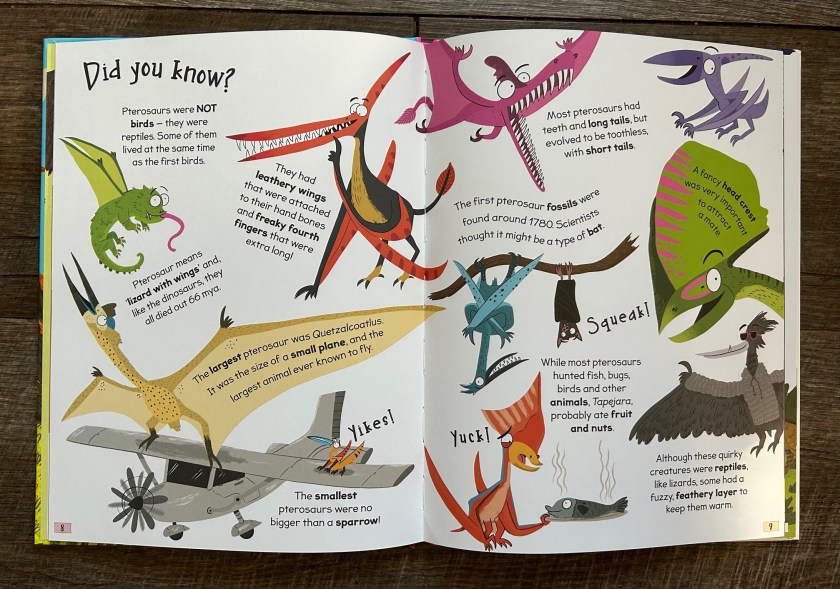 The cartoon illustrations by Jack Viant are perhaps a bit looser than I might have personally preferred (Did You Know Dino? and Mammoth is Mopey are good examples of cartoonish illustrations I like), but it is generally clear what species the illustrations intend to represent, even when unlabeled. This is perhaps best demonstrated by the pterosaurs on pages 8-9.