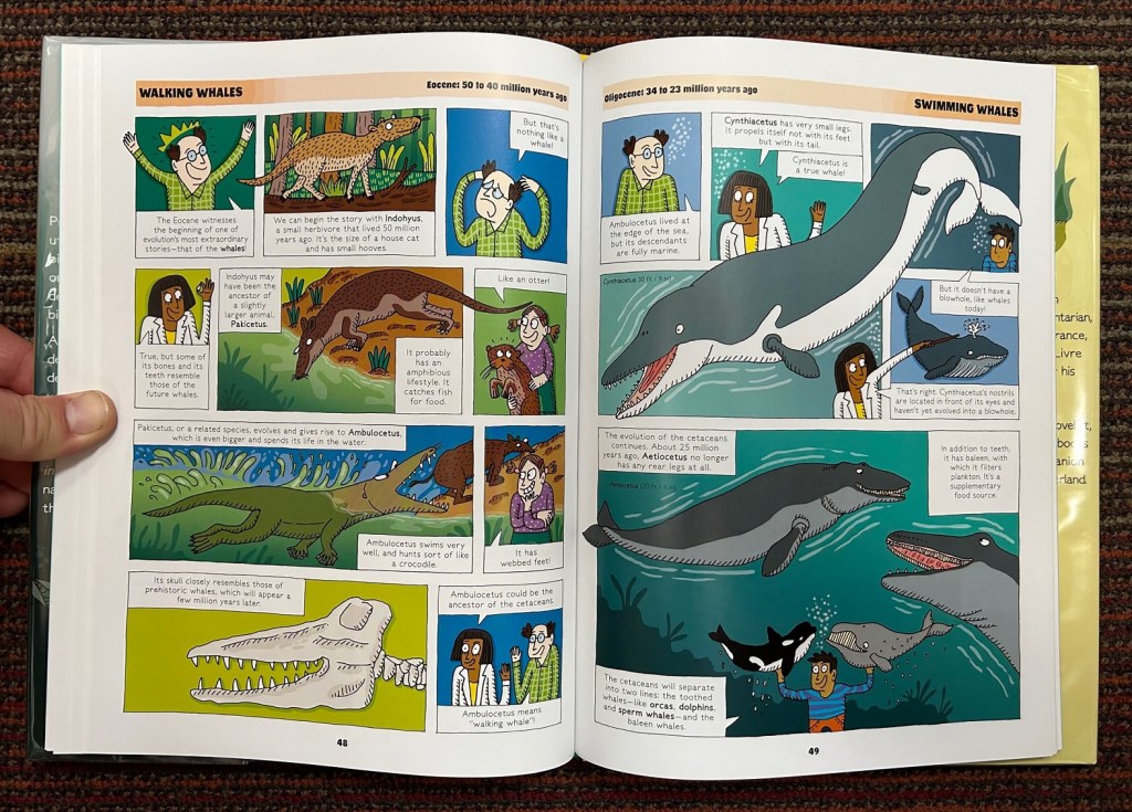 Whether or not it is super strict about where it shows certain species, it DOES portray an impressive diversity of them, including less charismatic ones, from the Paleozoic through the Pleistocene. If I may get especially nerdy for a moment, I was amused to note how one particular obscure species revealed the French background of the books’ creators. On a page on whale evolution where one might typically expect to see the more famous “serpent whale” Basilosaurus, the book instead depicts the very closely-related but rarely-depicted whale Cynthiacetus. While the actual fossils hail from the Americas, a complete skeleton of this extinct whale hang prominently in the natural history museum in Paris, likely inspiring its inclusion in this book.