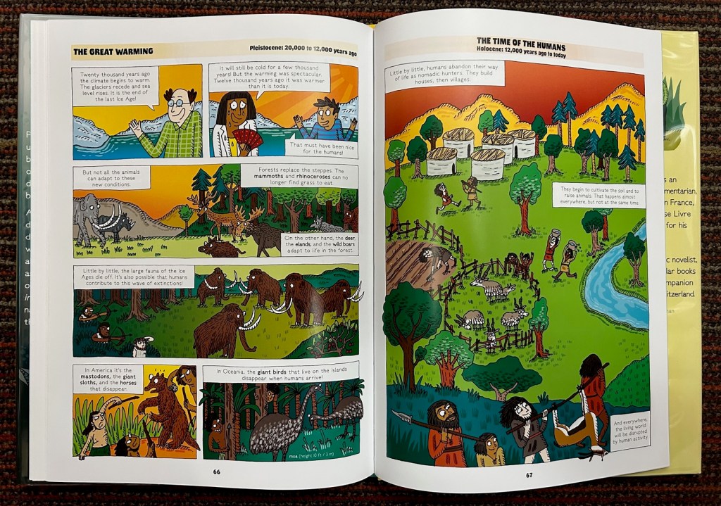 History of the World in Comics is a visual tour of Earth’s past, in a similar vein to Ashley Howard’s Earth Before Us series. Author Jean-Baptiste de Panafieu and illustrator Adrienne Barman follow a similar conceit to Howard’s, with an unnamed paleontologist and storyteller pair taking walking a couple of kids through Earth’s history, from its initial formation through the Anthropocene & beyond. (As a minor point of clarification, this book deals almost entirely in PRE-history, just in case you hold to the “written human record” definition of “history”. The original French title is the somewhat more accurate L’Evolution de la vie, or “The Evolution of Life”.)