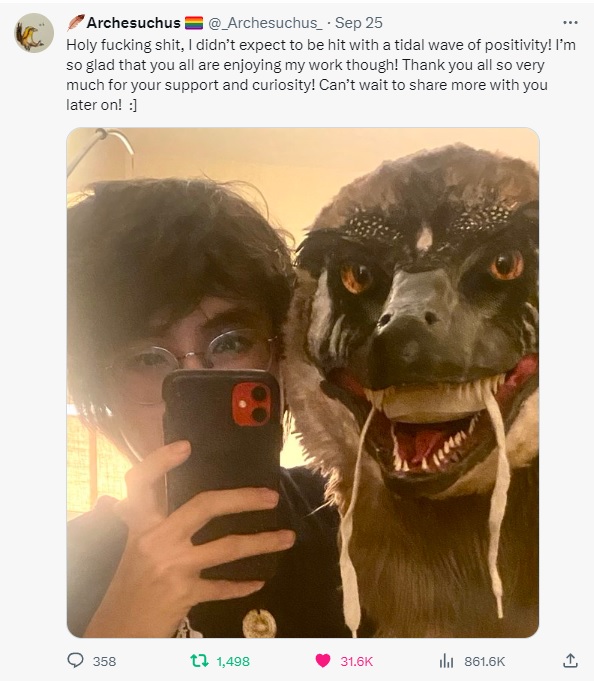 I’ll leave things there so as not to spoil the rest of the ongoing story, but suffice it to say, Archesuchus did a masterful job with this. It’s no wonder people responded so enthusiastically to it, and even began emulating it to varying degrees. Archesuchus was elated by the response, and shared a thank-you post featuring the dromaeosaur prop, which looks a lot cuter and less threatening when not stalking you from the other side of a darkened, all-too-flimsy-looking door!