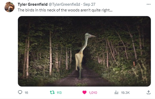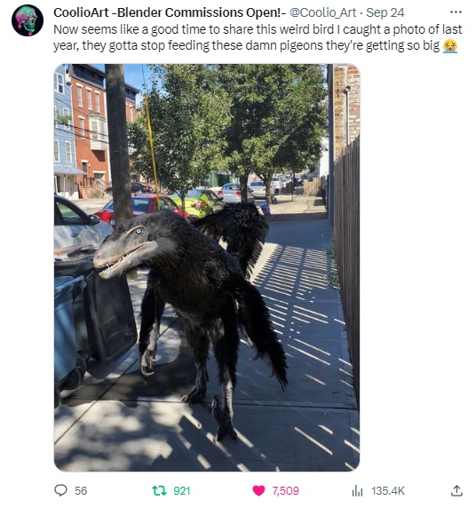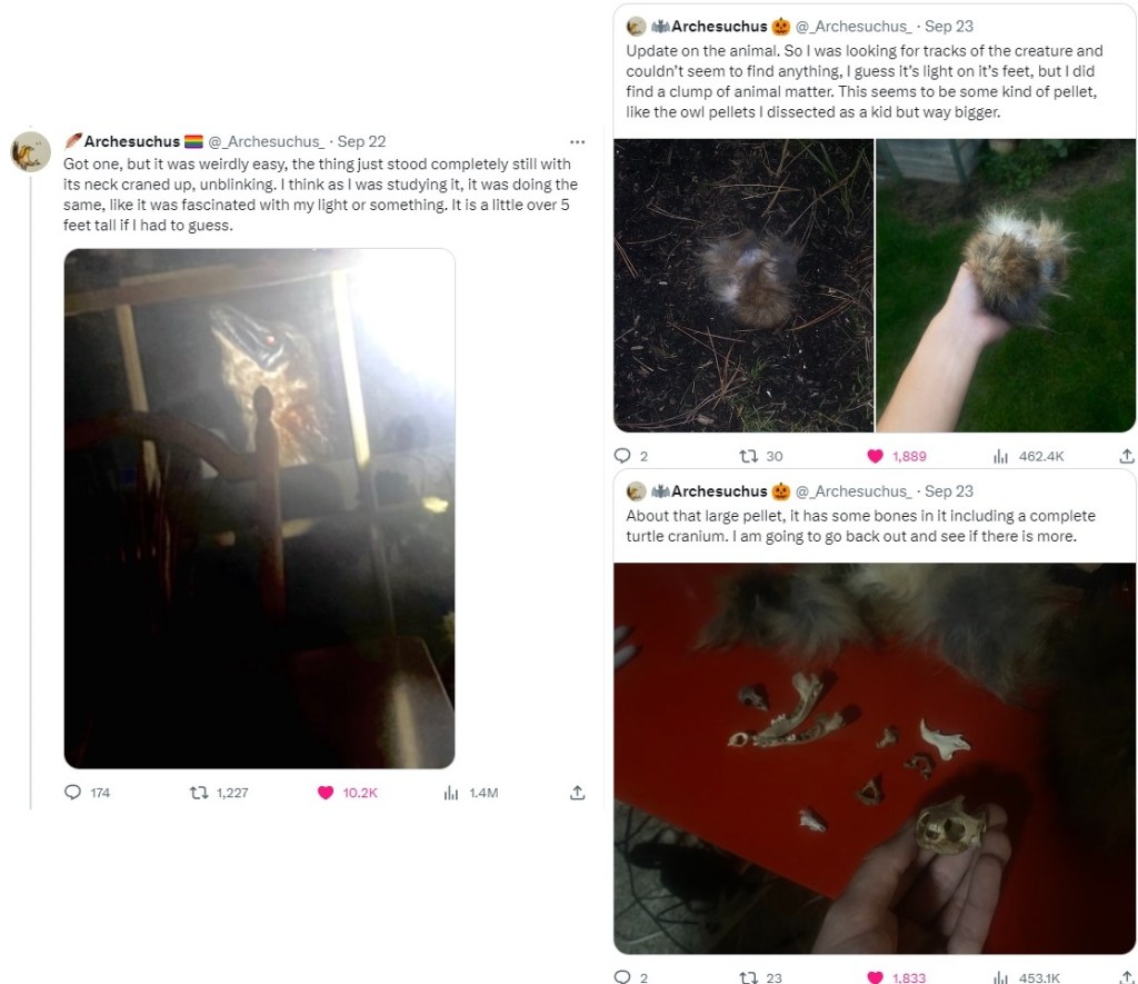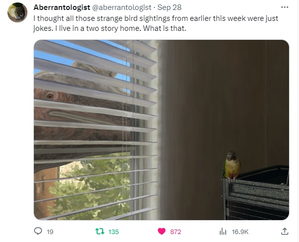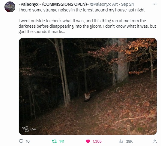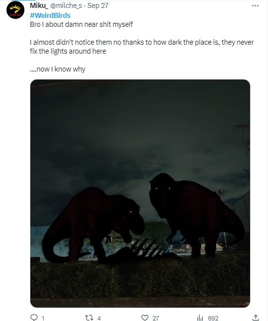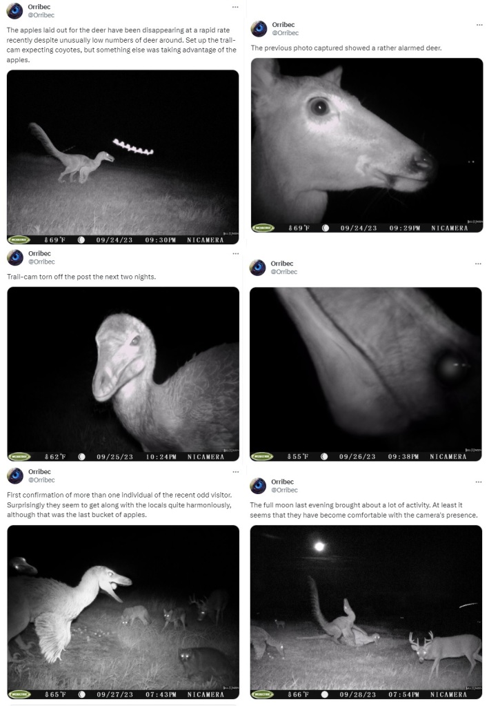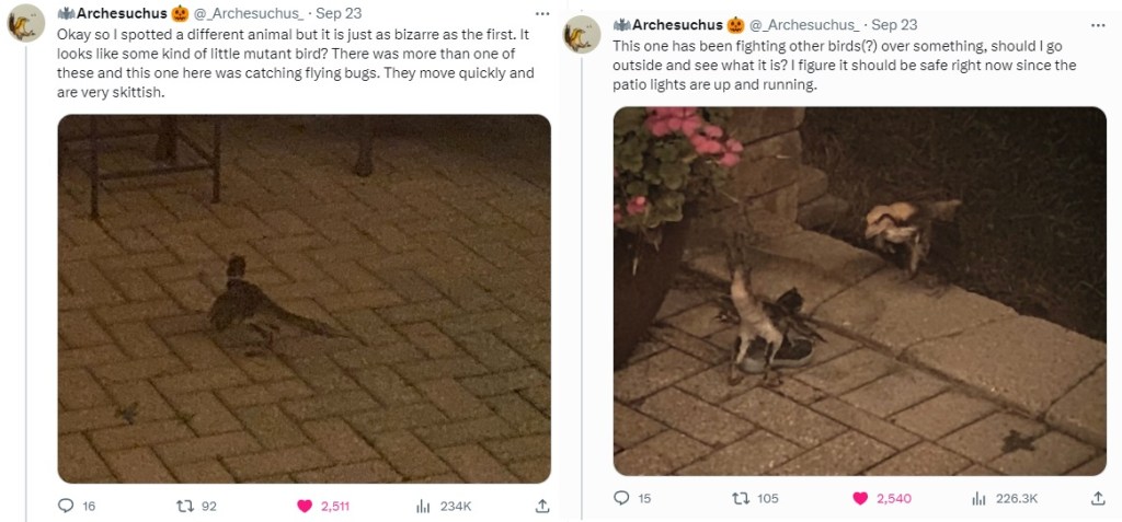 In the waning days of September 2023, a spooky trend arose, rather spontaneously, among social media circles of the saurian persuasion. Many users began reporting sightings of “weird birds” when checking outside, or even inside their houses; accompanied by semi-obscured snapshots of what seemed to be prehistoric beasts intruding into our comfortable modern lives…