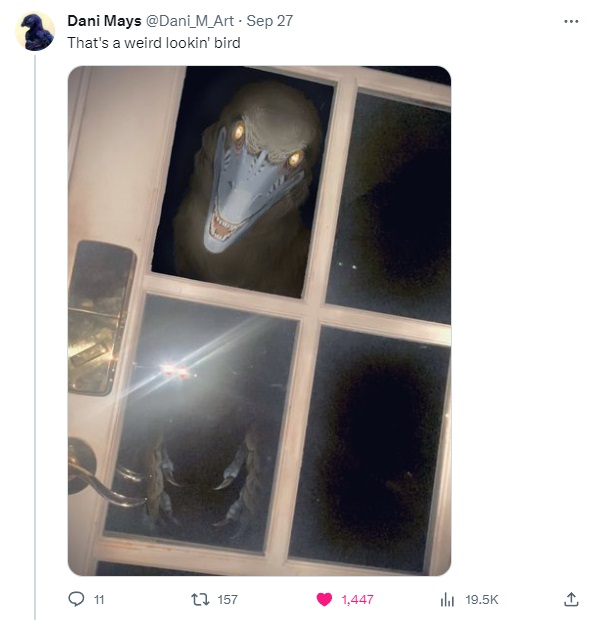 There were a few more possible antecedents, some of which I might mention later, but for now, let’s move on to our star feature. Even as I began to write this post, I assumed the current “weird birds” meme had popped up somewhat randomly between several accounts simultaneously, but apparently the horror story thread posted by Archesuchus more or less singlehandedly jumpstarted this entire trend! Starting with a photo of a dromaeosaur mask he had made, peering creepily through a door window, he began to weave an ongoing story about being stalked by unexplained prehistoric beasts. I highly recommend reading it yourself (starting here), as it is much more engrossing in its original context rather than recounted second hand.