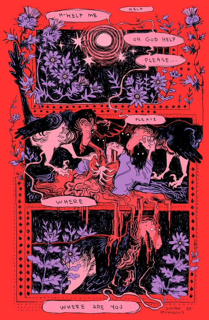 First came the chilling MIMIC, a one-page comic by Julian Francis Miholics‘s (AKA pansybeast or pansylair), which I’ve posted above. It ponders the possibility of whether dromaeosaurs might have had mimicry abilities on par with that of their modern relatives like corvids, parrots, lyrebirds, and more, and whether they might have been able to use such an ability to lure more victims to them. The slow reveal as your eye scrolls down the page absolutely made my skin crawl, as I realized the cries for help were coming from the raptors the whole time (or perhaps, even more creepily, they instead supersede the hapless human’s cries at some unknown point)!