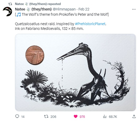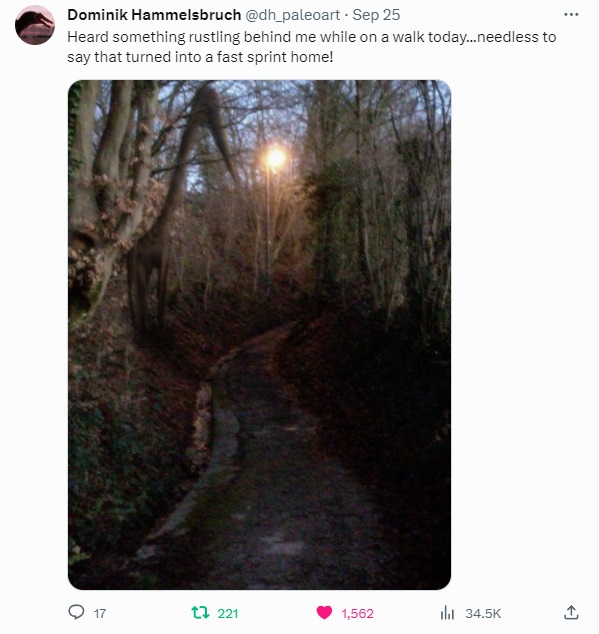 As I mentioned previously, this thread kicked off a wave of users getting in on the action, which included some extra love for a few creative pieces that actually preceded this trend, but got new life in the flurry of fresh excitement. Starting with a few of the latter, CoolioArt reposted a Deinonychus he had modeled in Blender, which I thought was a physical model at first glance! Natee Himmapaan reposted a dromaeosaur and a Quetzalcoatlus devouring a recent meal; the former now given the title “Dénouement”, in reference to the likely outcome of many of these “sightings”! Aldrich Hezekiah (AKA Kiabugboy) uniquely shared a non-reptilian creature in the form of the massive griffinfly Meganeura stuck near a doorway. There’s something that’s almost so mundanely familiar about this one, as my own front porch seems to gather bugs in some kind of instinctual trap, where they can’t seem to figure out that they can’t push through the brick corner, and so I could almost feel myself in the viewer’s place for this one.