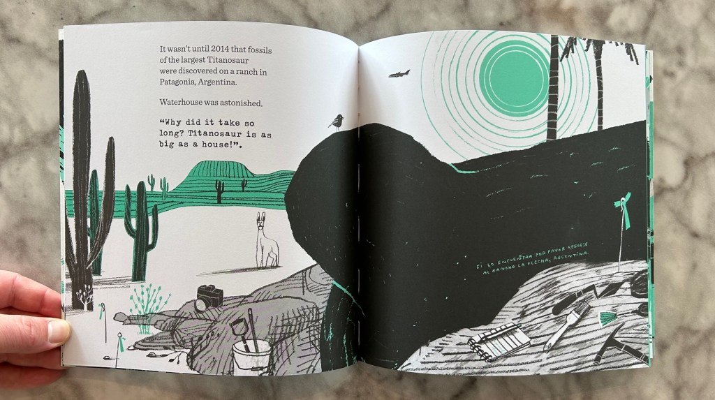 In contrast to the other Titanosaur book I have previously reviewed, this one is told in the form of a “day in the life” story as opposed to the more “matter of fact” presentation of the previous book. It is in this respect more similar to The Dinosaur Expert, though that story involves Patagotitan only tangentially. Our story here follows the perspective of Waterhouse the Mouse, an enthusiastic (if perhaps slightly oblivious) resident of the NHM. (His name is a reference to the architect of the museum, and not, as I originally supposed, Benjamin Waterhouse Hawkins.)